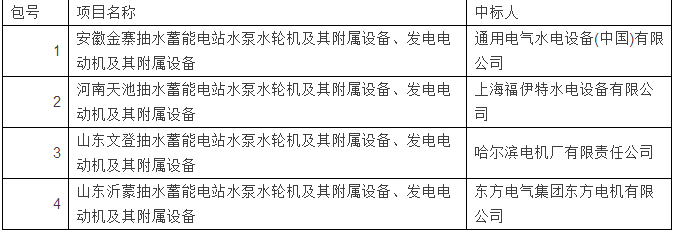 中標結(jié)果表明,國家電網(wǎng)正在建設(shè)的安徽金寨抽水蓄能電站、河南天池抽水蓄能電站、山東文登抽水蓄能電站、山東沂蒙抽水蓄能電站4大抽水蓄能電站的水泵水輪機及其附屬設(shè)備、發(fā)電電動機及其附屬設(shè)備中標人為4家不同的供應(yīng)商。