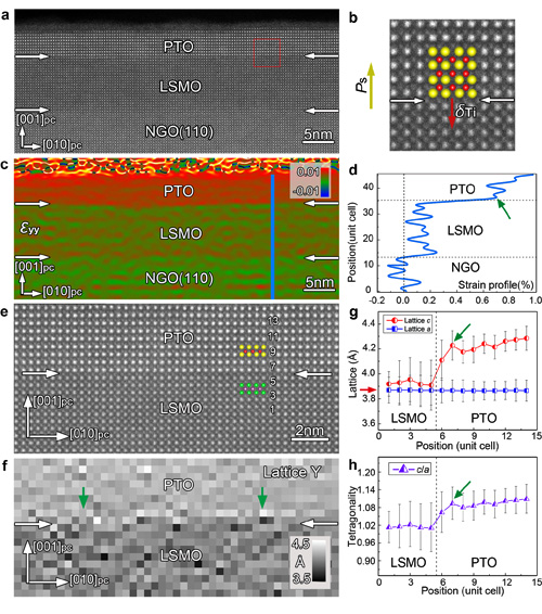 圖1、3.6nm PbTiO3/La0.7Sr0.3MnO3薄膜界面處的晶格參數(shù)和應變分析。顯示出PbTiO3/La0.7Sr0.3MnO3薄膜界面處面外晶格常數(shù)(g)以及四方性(h)顯著增加。