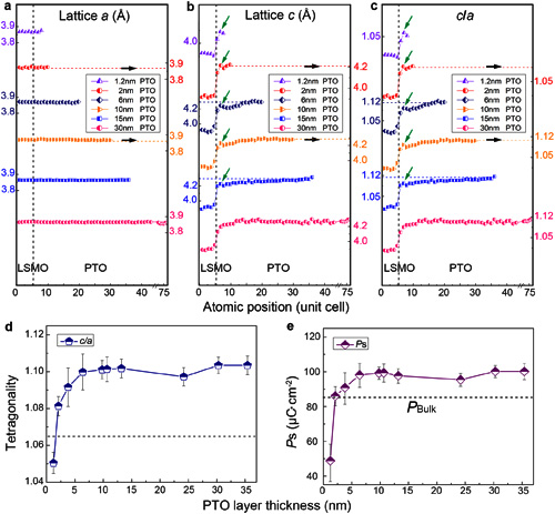 圖2、不同厚度(1.2nm, 2nm, 6nm, 10nm, 15nm)PbTiO3薄膜的晶格常數(shù)(a、b)以及四方性(c)變化,PbTiO3/La0.7Sr0.3MnO3界面處都存在面外晶格顯著拉長現(xiàn)象,四方性(d)以及(e)隨著厚度的變化顯示出當薄膜厚度為1.2nm時極化強度為50μC cm?2。