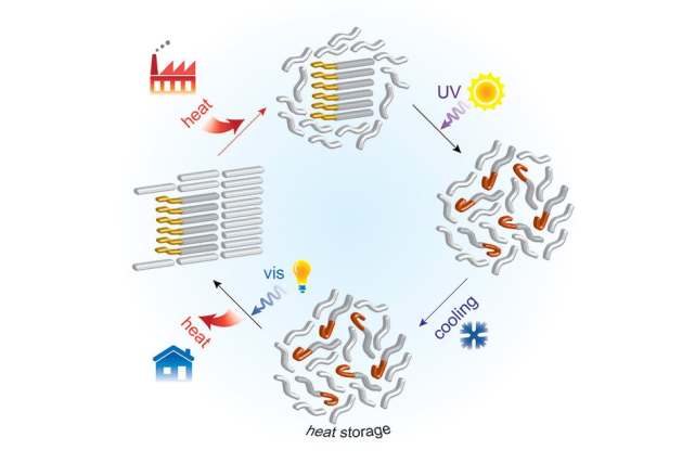 這種混合材料加熱即液化,但當(dāng)其暴露在紫外線下時(shí),即使再次冷卻下來,也還能維持液態(tài)。這種材料的大部分熱能,都能以每克200焦耳的量存儲起來,這在有機(jī)相變材料中,算儲存能力較強(qiáng)的。而當(dāng)其暴露在另一種光線下時(shí),就會固化,釋放熱能。