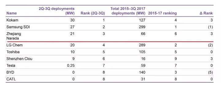彭博社2017年前三季度儲能投運(yùn)規(guī)模榜單,主要根據(jù)企業(yè)近期投運(yùn)的儲能項(xiàng)目規(guī)模進(jìn)行排名。