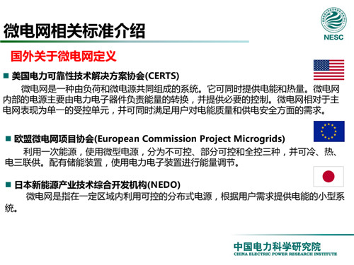 赫衛(wèi)國主任首先梳理了不同國家關(guān)于微電網(wǎng)的定義,美國電力可靠性技術(shù)解決方案協(xié)會(CERTS)認(rèn)為,微電網(wǎng)是一種由負(fù)荷和微電源共同組成的系統(tǒng)。它可同時提供電能和熱量。微電網(wǎng)內(nèi)部的電源主要由電力電子器件負(fù)責(zé)能量的轉(zhuǎn)換,并提供必要的控制。微電網(wǎng)相對于主電網(wǎng)表現(xiàn)為單一的受控單元,并可同時滿足用戶對電能質(zhì)量和供電安全方面的需求。而歐盟微電網(wǎng)項目協(xié)會(European Commission Project Microgrids) 則認(rèn)為微電網(wǎng)能夠利用一次能源,使用微型電源,分為不可控、部分可控和全控三種,并可冷、熱、電三聯(lián)供。配有儲能裝置,使用電力電子裝置進行能量調(diào)節(jié)。日本新能源產(chǎn)業(yè)技術(shù)綜合開發(fā)機構(gòu)(NEDO)將微電網(wǎng)定義為,一定區(qū)域內(nèi)利用可控的分布式電源,根據(jù)用戶需求提供電能的小型系統(tǒng)。