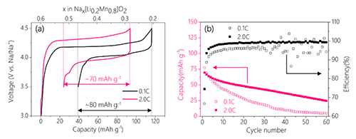 圖1.P3-Na0.6[Li0.2Mn0.8]O2層狀氧化物電化學(xué)性能:(A)0.1 C和2.0 C倍率下的典型充放電曲線;(B) 0.1 C和2.0 C倍率下的循環(huán)性能。