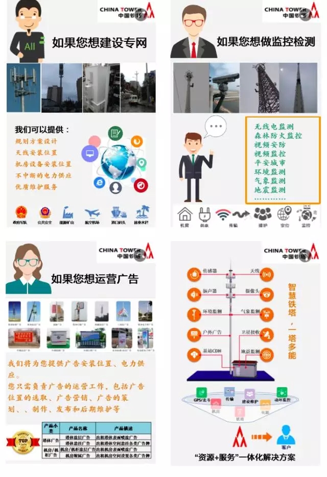 我們看到中國(guó)鐵塔的一些新業(yè)務(wù)宣傳,包括通信專(zhuān)網(wǎng),森林防火、海事、環(huán)保監(jiān)控,衛(wèi)星信號(hào)增強(qiáng),“一桿多用”智慧桿等等。