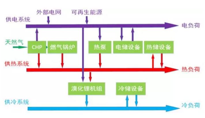 橫向來(lái)看依次是源網(wǎng)荷儲(chǔ)。源側(cè)包括常規(guī)的供電設(shè)備、CHP機(jī)組、燃?xì)忮仩t等設(shè)備,以及外部電網(wǎng)供電、可再生能源接入;網(wǎng)架分為冷熱電等傳輸系統(tǒng);荷側(cè)為園區(qū)內(nèi)部的電、熱、冷負(fù)荷;在儲(chǔ)能方面,不同能源子系統(tǒng)均有各自的儲(chǔ)能設(shè)備??v向來(lái)看依次是電、氣、熱、冷多能互補(bǔ)運(yùn)行。不同的能源子系統(tǒng)分別用不同的顏色表示,多種能源轉(zhuǎn)化設(shè)備(熱泵、CHP、燃?xì)忮仩t、溴化鋰機(jī)組)將不同的能源子系統(tǒng)相耦合。園區(qū)內(nèi)部多種能源形式以虛擬電廠的形式組合在一起綜合運(yùn)行,在保證電、熱、冷負(fù)荷可靠供應(yīng)的前提下,實(shí)現(xiàn)了能源的梯級(jí)利用,提高能效,降低用能成本。并且對(duì)于波動(dòng)性很強(qiáng)的可再生能源而言,綜合能源系統(tǒng)具有更多的靈活性,促進(jìn)了可再生能源的接納,進(jìn)一步提高系統(tǒng)經(jīng)濟(jì)性。