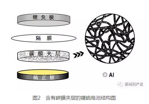此外,有研究者提出在正極和隔膜之間插入導電夾層,也能夠有效改善電池性能, 例如多壁納米碳管夾層,石墨烯夾層等。李合琴課題組用濾紙制備了導電碳膜,并進一步利用磁控濺射法在碳膜表面沉積了金屬鋁薄膜(圖2)。含有鍍鋁碳膜的電池性能得到了極大的改善,1C時首次放電比容量為1273 mAh/g,100循環(huán)之后仍保有924 mAh/g的可逆容量,并且200 循環(huán)之后的庫倫效率仍維持在95%以上。
