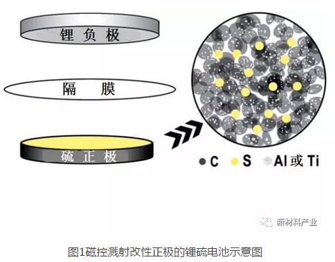 許多研究工作集中于采用化學方法對鋰硫電池進行改性,最近有學者報道了通過物理氣相沉積方法,例如磁控濺射法,對鋰硫電池進行改性并且實現(xiàn)了穩(wěn)定的循環(huán)性能。以活性炭(AC)作為導電基體,單質硫作為活性物質,制備了鋰硫電池正極材料S/AC,并采用射頻磁控濺射法將Al和Ti分別沉積在S/AC電極表面(圖1),對電極進行改性處理,以期提高電池性能。實驗表明在0.5C充放電倍率下,正極表面鍍鈦和鍍鋁的鋰硫電池初始放電比容量分別為1255mA/g和1257mAh/g,100次循環(huán)后保持在722mAh/g和977mA/g,庫侖效率高于97%。