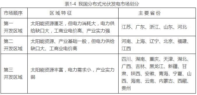 此外,國家和各級政府為了推廣分布式光伏也都陸續(xù)發(fā)布了相應(yīng)的補(bǔ)貼政策,廣大老百姓已經(jīng)在政策補(bǔ)貼和環(huán)保意識的驅(qū)動下,對分布式光伏發(fā)電從感興趣,想了解到紛紛投資建設(shè),方興未艾,如火如荼。大大小小的光伏企業(yè)也紛紛進(jìn)入該領(lǐng)域,八仙過海各顯神通,力求分得一塊蛋糕。我國中東部地區(qū)的浙江省、江蘇省、安徽省、山東省等已經(jīng)成為分布式光伏發(fā)電規(guī)模較大、增長快速的地區(qū),光伏項目從資源更好的西北地區(qū)向中東部轉(zhuǎn)移,說明電網(wǎng)消納和政策環(huán)境已經(jīng)成為影響投資決策的更重要因素,也就是說,電力需求規(guī)模越大,電力供給缺口越大,工商業(yè)電價越高,太陽能資源越豐富,太陽能產(chǎn)業(yè)基礎(chǔ)越雄厚,對分布式光伏發(fā)電項目的需求就越大。根據(jù)上述規(guī)律,對我國分布式光伏發(fā)電市場的劃分如表1-4所示。