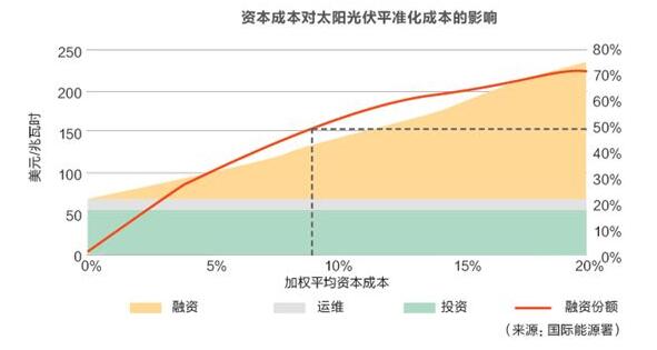 而具體到墨西哥的情況,優(yōu)越的自然資源(資源量超過2000小時),大企業(yè)的介入,資本成本低是與之前所有低價項目共同的特點。其中,對于資本更加密集(沒有燃料成本)的可再生能源,資本成本的高低,對項目的長期平均成本具有顯著的影響。國際能源署的計算顯示,對光伏發(fā)電,加權(quán)平均資本(自由資金收益率+貸款利息)成本從4.5%升至9%,其平均成本將提高50%。反之,如果能夠獲得幾乎零成本的融資,那么其項目成本可以再下降一半。