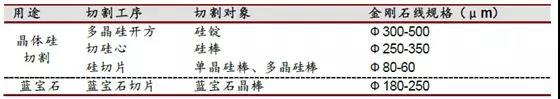 從目前金剛石線需求最大的兩大下游行業(yè)分析,藍(lán)寶石切割與晶體硅切割對金剛石線的技術(shù)規(guī)格要求不盡相同。