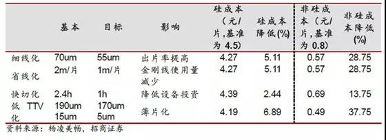 金剛線應(yīng)用顯著降低單晶、多晶硅片環(huán)節(jié)成本。單晶硅片切割在2015-2016成功導(dǎo)入金剛線以后,單晶硅片成本獲得了顯著降低,也對多晶硅片產(chǎn)業(yè)形成了較大的擠壓。