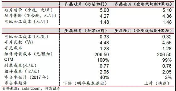 2016-2017年,主要的多晶硅企業(yè),紛紛開始推廣金剛線+黑硅技術(shù),預(yù)計(jì)到2018年,主要的多晶硅企業(yè),將基本完成金剛線技術(shù)對砂漿切割的替換。
