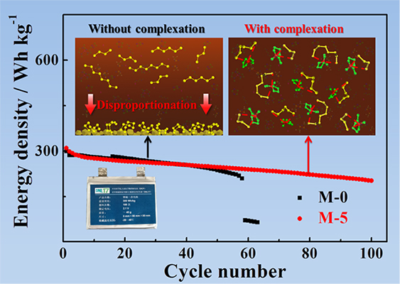 鋰硫電池具有能量密度高、成本低、環(huán)境友好的優(yōu)勢,是國際儲能領(lǐng)域的研究熱點之一。然而,由于鋰硫電池存在多硫化鋰飛梭、多硫化鋰歧化、電解液分解、金屬鋰枝晶粉化等問題,導(dǎo)致其循環(huán)壽命短,尚未滿足大規(guī)模產(chǎn)業(yè)化發(fā)展的要求。該研究團隊針對多硫化鋰歧化的問題,基于“軟硬酸堿理論”,通過在電解液引入大體積陽離子來絡(luò)合多硫根離子,有效提高了多硫化鋰在電解液中的穩(wěn)定性。采用該電解液組裝的5000mAh鋰硫電池器件的比能量可達300Wh/kg,且穩(wěn)定循環(huán)100次以上,容量保持率約70%。該工作為提高鋰硫電池的循環(huán)壽命提供了新思路和新策略。