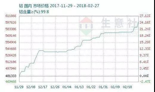 進入2018年以后,這種上漲趨勢仍在持續(xù)。據(jù)生意社商品動態(tài),2月27日,國內(nèi)主要有色金屬現(xiàn)貨市場金屬鈷價格上漲,鈷報價均價為601666.69元/噸,較上一交易日上漲0.28%。