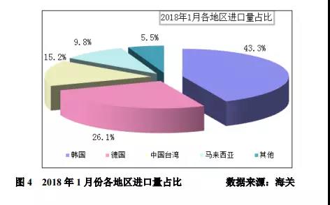第二,從德國進口量位居高位。1月份從德國進口量為4252噸,環(huán)比增加11.7%,占總進口量的26.2%,1月份進口量實際為12月份交易情況,而2017年12月份下游需求仍維持火熱,因此從德國進口量位居高位。