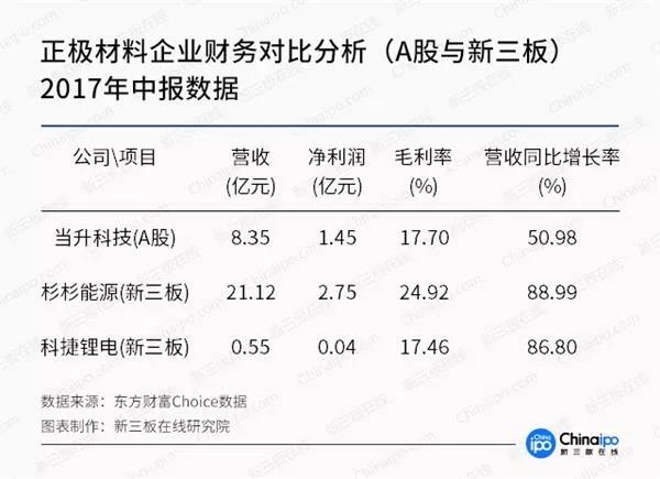 如果對(duì)分類財(cái)務(wù)指標(biāo)進(jìn)一步分析,可以發(fā)現(xiàn),新三板的杉杉能源全面勝出,無論是營(yíng)收還是凈利潤(rùn),亦或是毛利率和成長(zhǎng)性,均高出A股上市公司當(dāng)升科技。