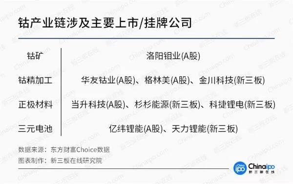 而國(guó)內(nèi)來說,精煉鈷的主要公司有華友鈷業(yè)(A股)、格林美(A股)、金川科技(新三板)。其余中下游如正極材料和三元電池也都出現(xiàn)了A股和新三板公司的身影。