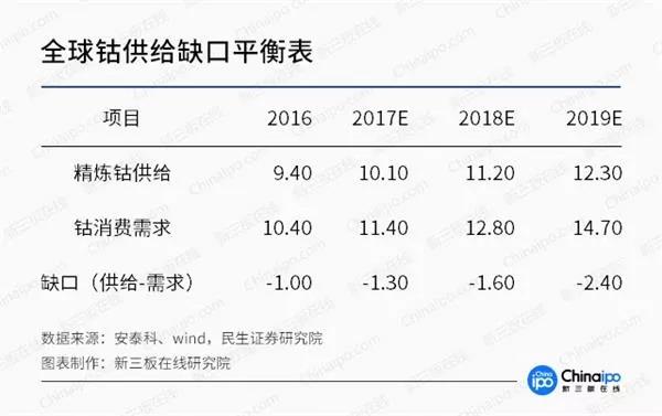 從產(chǎn)業(yè)鏈角度看,短期內(nèi)鈷礦擴(kuò)產(chǎn)的能力不及下游需求的爆發(fā)力強(qiáng)。首先,在鈷礦方面被少數(shù)巨頭掌握,對(duì)下游的議價(jià)能力強(qiáng)勁。但是下游的需求擴(kuò)張已經(jīng)來臨,這一快一慢對(duì)比之下,鈷的供需極度不平衡。根據(jù)民生證券研究院的預(yù)測(cè),2017至2019年的供給缺口分別將達(dá)1.3萬噸、1.6萬噸和2.4萬噸。