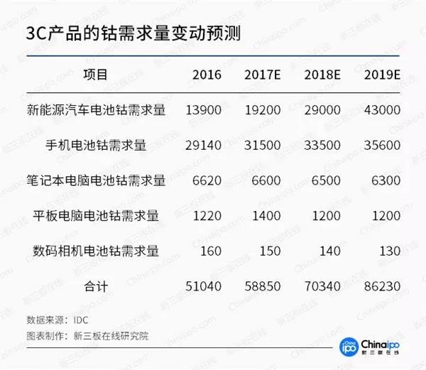 根據(jù)IDC相關(guān)預(yù)測(cè),2017-2019年,手機(jī)產(chǎn)品的鈷需求量分別為3.15萬噸、3.35萬噸、3.56萬噸;筆記本電腦的鈷需求量分別為0.66萬噸、0.65萬噸、0.63萬噸;平板電腦的鈷需求量依次為0.14萬噸、0.12萬噸、0.12萬噸;數(shù)碼相機(jī)的鈷需求量分別為150噸、140噸和130噸。