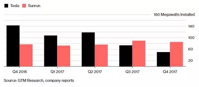 而其競(jìng)爭(zhēng)對(duì)手SunRun公司,則在2017年第四季度以85兆瓦的安裝量領(lǐng)先美國(guó)戶用光伏市場(chǎng)。這并非SunRun首次超越SolarCity,在前一季度,特斯拉的戶用光伏安裝量同樣不及SunRun。