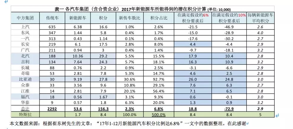 每個(gè)法人單位的數(shù)據(jù)不容易獲得,但如表一所示,假如我們?cè)O(shè)想2017年需要完成10%的積分要求的話,擁有合資企業(yè)的前五大集團(tuán)公司都是缺分大戶。假如我們?cè)O(shè)想2017年需要完成6%的積分要求的話,五大集團(tuán)中只有長(zhǎng)安有多余積分,但長(zhǎng)安和其合資企業(yè)福特需要新能源汽車的正積分來(lái)抵油耗標(biāo)準(zhǔn)的負(fù)積分。當(dāng)然第一大戶上汽乘用車本身,不包括合資部分,2017年新能源車積分已達(dá)到13%;可以設(shè)想上汽的多余積分會(huì)留在集團(tuán)內(nèi)。所有企業(yè)中,有最多盈余積分的是比亞迪,后面遠(yuǎn)遠(yuǎn)跟著的是吉利和北汽。在本土企業(yè)里,長(zhǎng)城最低,但還是遠(yuǎn)遠(yuǎn)好于合資企業(yè)。表一所示,整個(gè)行業(yè)去年平均每輛新能源汽車可產(chǎn)生2.9個(gè)積分。東風(fēng)集團(tuán)的新能源車每輛可得4個(gè)積分。比亞迪因?yàn)橛性S多插電混合動(dòng)力車,平均分為3。而上汽的新能源車平均每輛獲得2.6分。