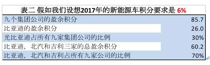 假如我們?cè)O(shè)想2017年實(shí)行6%的新能源汽車積分政策,在表一中共有9個(gè)集團(tuán)公司有盈余積分。比亞迪的盈余積分占可交易的全部盈余積分的30%。比亞迪、吉利和北汽集團(tuán)共占市場(chǎng)的70%(表二)。