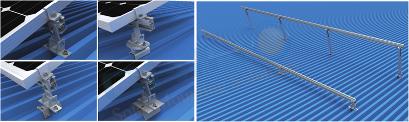 對(duì)于彩鋼瓦屋頂不朝陽的情況,晨科彩鋼瓦傾斜支架就是這樣一款設(shè)計(jì)用于不同朝向彩鋼瓦屋面的光伏支架系統(tǒng)。該款支架最大的優(yōu)勢(shì)在于能解決屋面朝向的不同,不破壞屋面自防水系統(tǒng),利用該系統(tǒng)的前后腳來達(dá)到最佳日照角度,根據(jù)客戶需求,實(shí)現(xiàn)太陽能板與屋面的持平或者高于屋面。這樣一來,雖然屋頂是不朝南的,但是在該支架系統(tǒng)的作用下,可以使電站矩陣朝南,獲取足夠的日照,從而實(shí)現(xiàn)發(fā)電量最大收益。