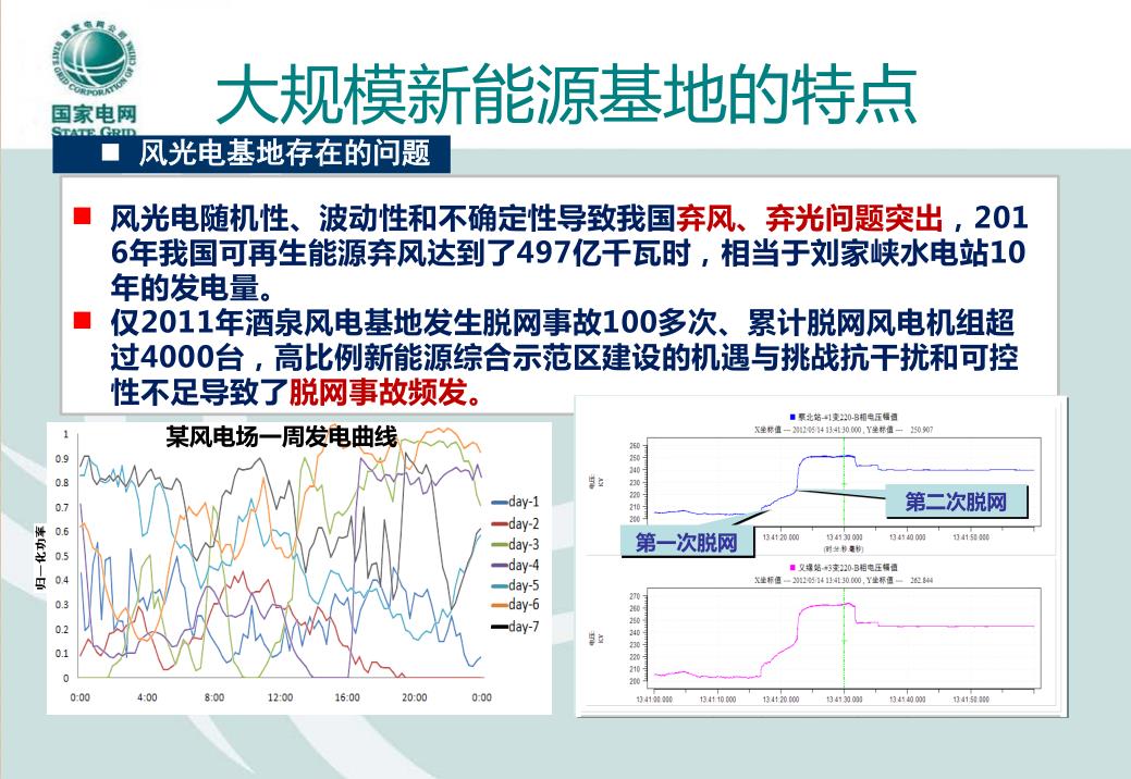 這是我們的資源屬性風(fēng)電的特點,風(fēng)電最主要的帶是沿著北方的一線拉過去的,其中絕大部分是其中在蒙古高原及其邊遠(yuǎn)地帶。在發(fā)展過程中,這幾年稍微有點變化,2015年,風(fēng)電80%集中在三北地區(qū),西部地區(qū)集中著60%以上的光伏。未來,我們的資源和稟賦決定了這種發(fā)展將是我們主要的發(fā)展趨勢。在這種發(fā)展模式下形成了大規(guī)模集中開發(fā)、遠(yuǎn)距離送出的發(fā)展態(tài)勢。我以九泉新能源基地為例,在九泉這樣1000公里以外的地方,建設(shè)著千萬千瓦的風(fēng)電基地,現(xiàn)在大概有1500多萬千瓦的風(fēng)光電集中在區(qū)域內(nèi)。這種發(fā)展模式在全世界是獨有的,也就是距離負(fù)荷中心1000公里,像北京到南京的直線距離,蘭州到太原的空中直線距離也是1000多米。而且1500萬千瓦已經(jīng)遠(yuǎn)遠(yuǎn)超過了歐洲很多國家,比如丹麥的風(fēng)電和光伏裝機容量加起來只有600萬千瓦。所以這個規(guī)模已經(jīng)是相當(dāng)大了。風(fēng)電本身的隨機波動性導(dǎo)致輸電難以控制,運行控制和系統(tǒng)穩(wěn)定都面臨巨大的挑戰(zhàn),并且存在很大的問題,其中也包括后面分析的調(diào)峰調(diào)頻方面的問題。