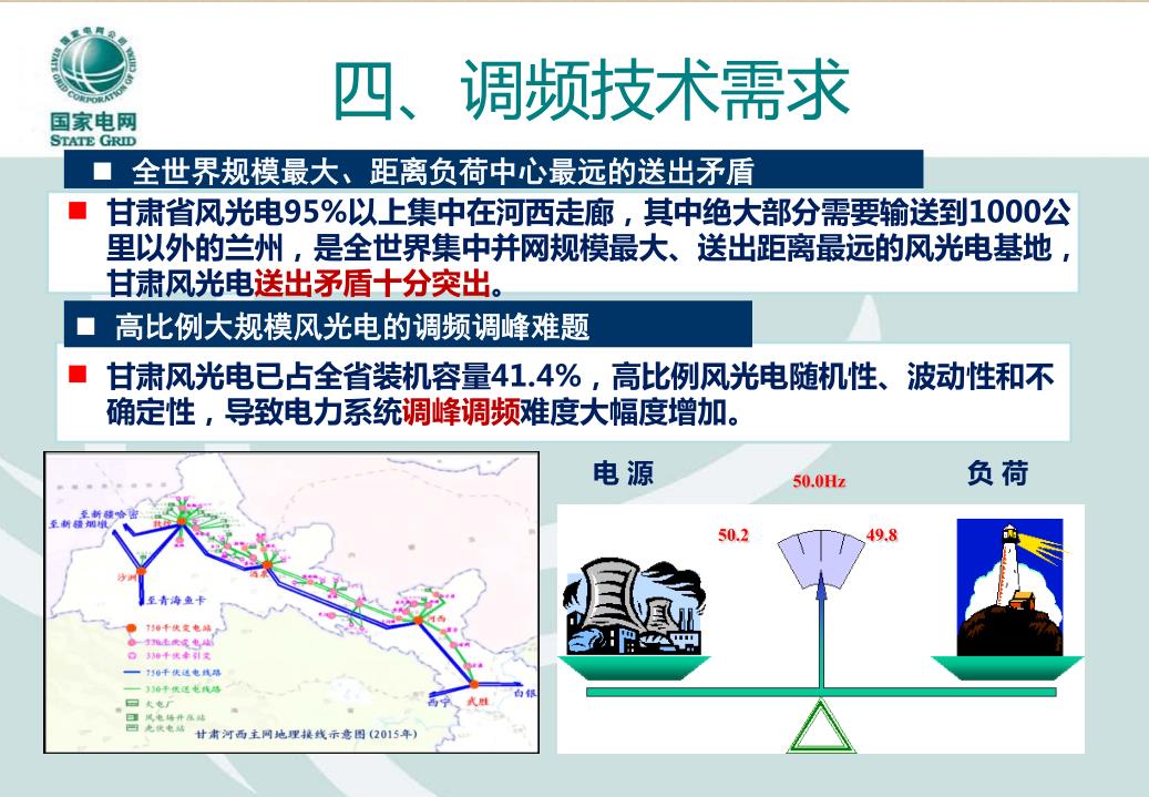 甘肅個別時段的理論出力已經(jīng)達(dá)到用電負(fù)荷的70%以上,理論出力的值甚至達(dá)到90%,甚至100%的水平。這個時候,如果電力系統(tǒng)可再生能源的發(fā)展使得整個電力系統(tǒng)常規(guī)電源的調(diào)頻能力不足,導(dǎo)致調(diào)頻的矛盾日益突出,需要用其他的手段來參與。而且在緊急狀態(tài)下,特別是事故狀態(tài)下的調(diào)頻需求,更是很難替代,急需一種在緊急狀態(tài)下頻率穩(wěn)定支撐的有效的元素。
