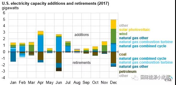2017年有6.3吉瓦煤電裝機(jī)退役,而且全年沒有任何一座新的煤電廠投運(yùn),2017年末煤電總裝機(jī)為260.3吉瓦。這一年盡管也有4.0吉瓦的天然氣發(fā)電裝機(jī)退役,但是新增天然氣裝機(jī)9.3吉瓦(其中8.2吉瓦為聯(lián)合循環(huán)機(jī)組),年末總裝機(jī)為452.8吉瓦。
