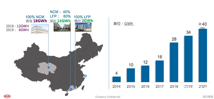 2019年青?;亟ǔ珊?,比亞迪在中國的動力電池年產(chǎn)能可達(dá)到34GWh。青?;厝可a(chǎn)三元電池,年產(chǎn)能高達(dá)18GWh;深圳基地年產(chǎn)能14GWh,三元電池占40%;而比亞迪惠州基地則專注于磷酸鐵鋰電池的生產(chǎn),年產(chǎn)能為2GWh。