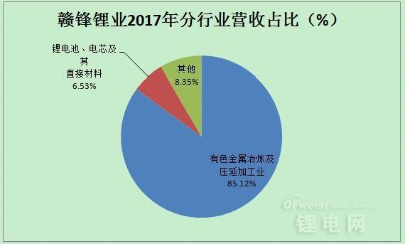 分行業(yè)實現(xiàn)營收來看,贛鋒鋰業(yè)2017年在有色金屬冶煉及壓延加工業(yè)方面實現(xiàn)總營收的85.12%,鋰電池、電芯及其直接材料占比為6.53%,其他行業(yè)占比為8.35%。