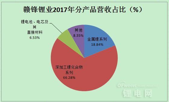 分產(chǎn)品實現(xiàn)營收來看,贛鋒鋰業(yè)2017年在深加工鋰化合物系列方面實現(xiàn)營收占比較大,達(dá)66.28%,金屬鋰系列,鋰電池、電芯及其直接材料及其他產(chǎn)品實現(xiàn)營收則為43.72%。