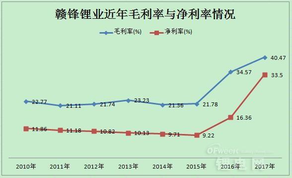 贛鋒鋰業(yè)近年在鋰電池行業(yè)的毛利率與凈利潤也在逐年增長,從2010年的毛利率22.11%至2017年增長到40.47%,凈利率也由11.86%增長至33.50%。