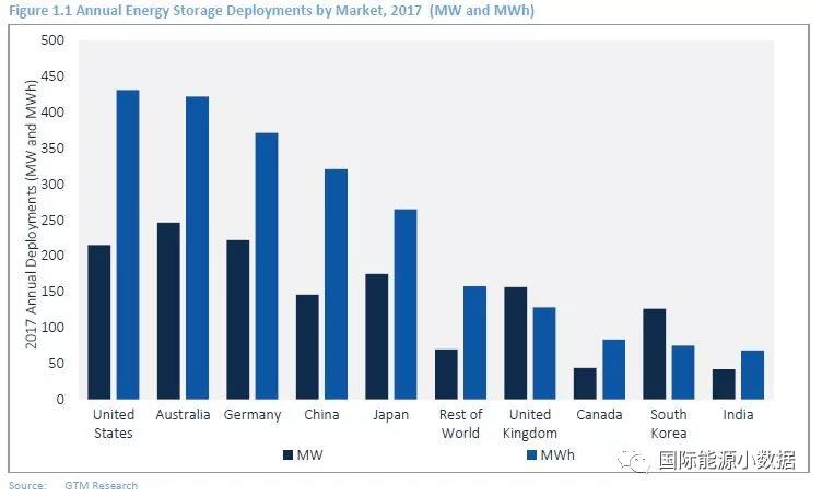 中國(guó)儲(chǔ)能網(wǎng)訊:根據(jù)GTMResearch日前發(fā)布全球儲(chǔ)能報(bào)告,2017年全球新增儲(chǔ)能容量1.4吉瓦、電量230萬(wàn)千瓦時(shí)。從容量的角度來(lái)看,澳大利亞新增246兆瓦,居全球首位;從電量的角度看,美國(guó)新增43.1萬(wàn)千瓦時(shí),居全球首位。2017年中國(guó)的新增儲(chǔ)能容量約為150吉瓦/32萬(wàn)千瓦時(shí)。