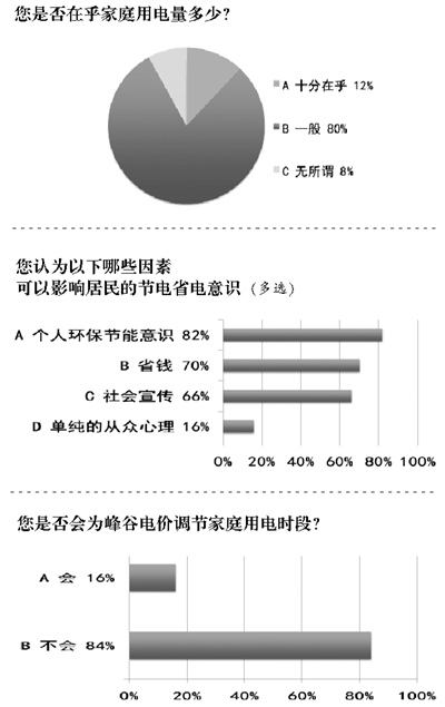 對于“您是否在乎家庭用電量多少”這個問題,八成居民表示對用電量的在乎程度一般,還有8%表示無所謂,只有12%的居民認(rèn)為自己十分在乎家庭用電量(見圖表)。