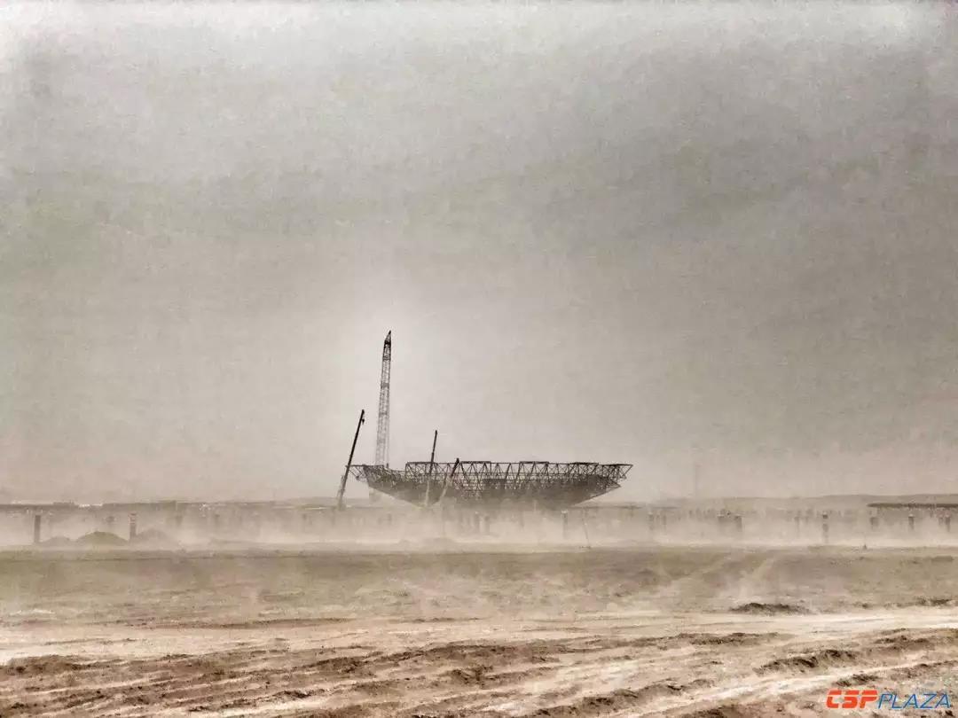 中國儲能網(wǎng)訊:這不是科幻電影,這是在建的玉門鑫能50MW二次反射熔鹽塔式電站的建設(shè)場景(下圖),當(dāng)天,沙塵暴侵襲了該項目地。