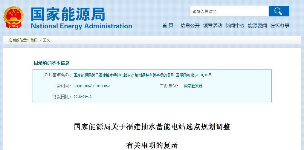國家能源局關(guān)于福建抽水蓄能電站選點規(guī)劃調(diào)整有關(guān)事項的復(fù)函
