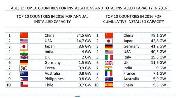 對(duì)比2016年全球新增裝機(jī)和累計(jì)裝機(jī)排名前10的國(guó)家(如下圖所示)可以看出,2017年,以中國(guó)、印度的亞洲市場(chǎng)新增裝機(jī)保持快速增長(zhǎng),并成為支撐全球光伏擴(kuò)張的重要力量,而以美國(guó)、德國(guó)為代表的歐美地區(qū)國(guó)家新增裝機(jī)則普遍出現(xiàn)增速放緩甚至負(fù)增長(zhǎng)。此外,巴西、澳大利亞等新興市場(chǎng)開(kāi)始嶄露頭角,增長(zhǎng)勢(shì)頭較為明顯。