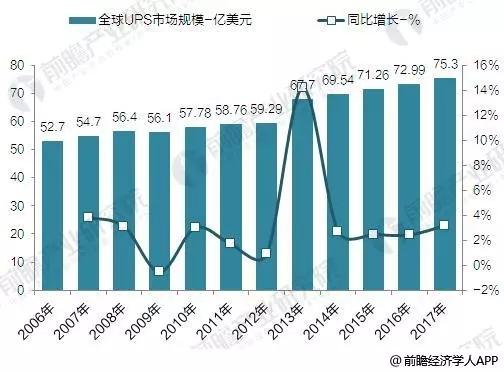 根據(jù)前瞻產(chǎn)業(yè)研究院發(fā)布的《2018-2023年中國(guó)不間斷電源(UPS)行業(yè)市場(chǎng)前瞻與投資戰(zhàn)略規(guī)劃分析報(bào)告》數(shù)據(jù)顯示,2006-2016年全球UPS市場(chǎng)銷售額逐年增長(zhǎng),但整體保持較低的增速,2013年全球UPS市場(chǎng)規(guī)模約為67.70億美元,同比增長(zhǎng)14.18%,為從2006年以來(lái)歷年最高增速;2016年全球UPS市場(chǎng)規(guī)模約為72.99億美元,同比上漲2.43%。