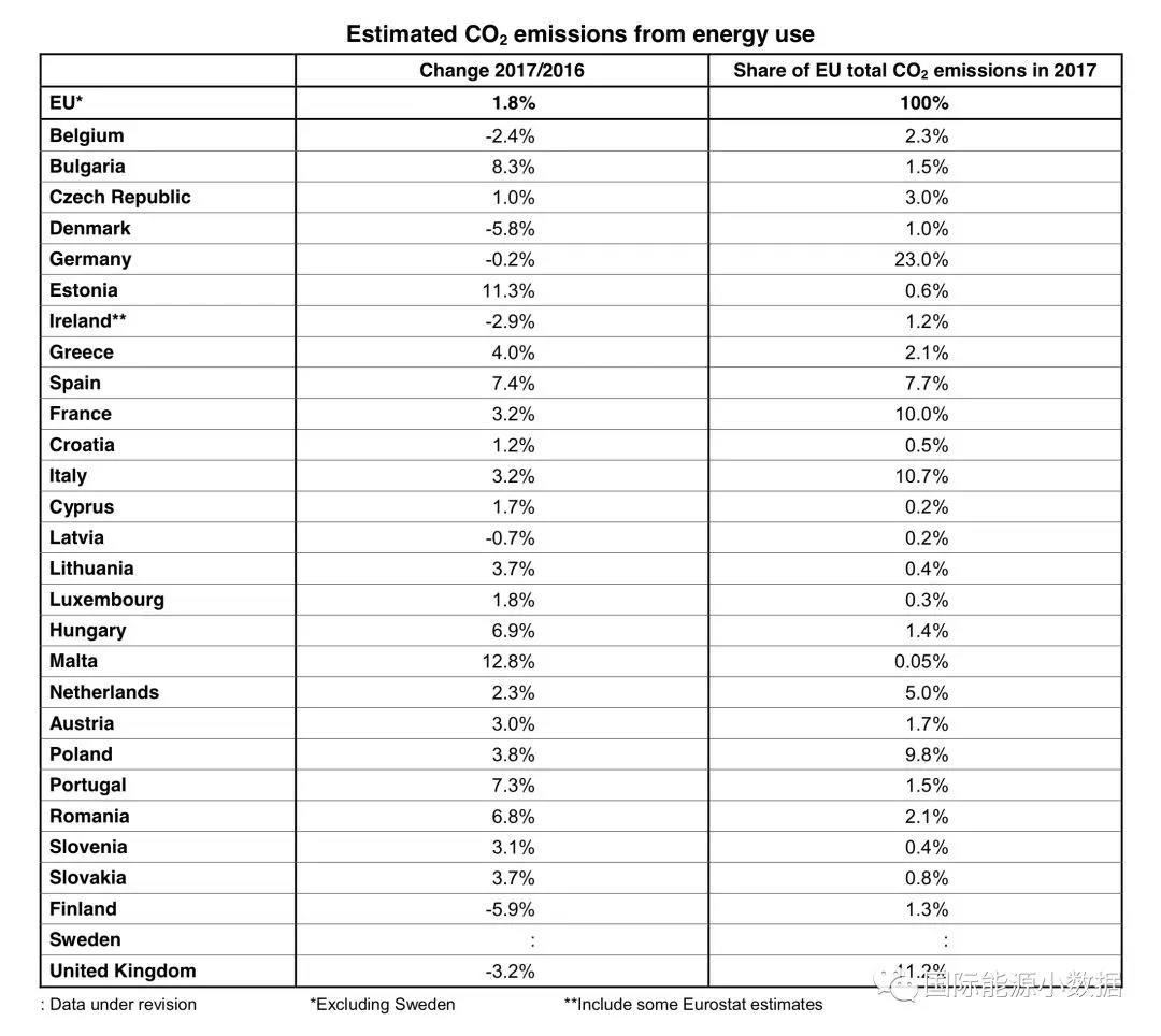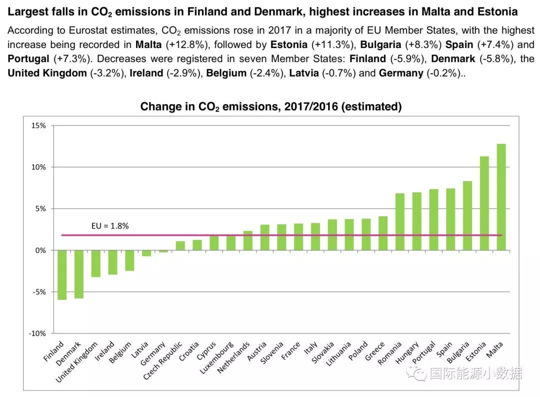 中國(guó)儲(chǔ)能網(wǎng)訊:根據(jù)Eurostat剛剛發(fā)布的數(shù)據(jù),2017年歐盟國(guó)家能源相關(guān)的碳排放比2016年增長(zhǎng)1.8%。歐盟國(guó)家中排放增長(zhǎng)幅度比較大的國(guó)家有:馬耳他(+12.8%)、愛(ài)沙尼亞(+11.3%)、保加利亞(+8.3%)、西班牙(+7.4%)、葡萄牙(+7.3%);排放減少的國(guó)家有:芬蘭(-5.9%)、丹麥(-5.8%)、英國(guó)(-3.2%)、愛(ài)爾蘭(-2.9%)、比利時(shí)(-2.4%)、拉脫維亞(-0.7%)、德國(guó)(-0.2%)。