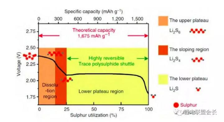 以硫放電過(guò)程為例,簡(jiǎn)單可以分為兩個(gè)階段,首先固態(tài)單質(zhì)硫S8與Li+生成液態(tài)的Li2S8,隨著放電程度的深入會(huì)經(jīng)過(guò)可溶性Li2S6最終生成可溶性Li2S4,對(duì)應(yīng)電壓平臺(tái)2.4 V - 2.1V,此過(guò)程由于有液態(tài)物質(zhì)的生成,反應(yīng)速度較快。接著隨著進(jìn)一步的放電,在2.1 V電壓平臺(tái)處,可溶性Li2S4轉(zhuǎn)化成不溶性的固相 Li2S2,最后再進(jìn)一步生成終產(chǎn)物固相的Li2S,由于這一階段中固體開始生成,使得離子擴(kuò)散變慢,所以反應(yīng)速度較緩。不同于傳統(tǒng)的鋰離子電池材料,鋰硫電池充放電時(shí)單質(zhì)硫和硫化鋰中間經(jīng)過(guò)多硫化鋰Li2Sx(x=2-8)而并不是通過(guò)鋰離子在正極材料和負(fù)極材料之間的往返嵌入和脫嵌來(lái)實(shí)現(xiàn)充放電的,因此鋰硫電池性能受正極材料的鋰離子脫嵌能力影響小。