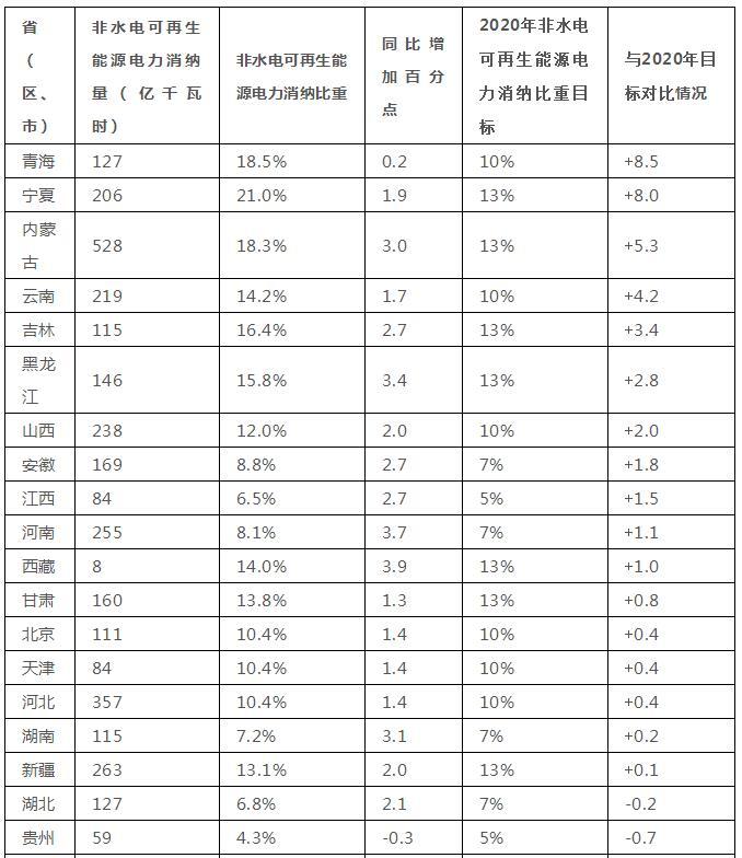 從非水電可再生能源消納比重來看,青海、寧夏、內(nèi)蒙古最高,均超過18%;從非水電可再生能源消納同比增長(zhǎng)來看,西藏、陜西、河南三?。▍^(qū))同比增長(zhǎng)較快,分別同比上升了3.9、3.9和3.7個(gè)百分點(diǎn);從完成2020年非水電可再生能源電力消納比重目標(biāo)情況來看,寧夏、青海、內(nèi)蒙古等17個(gè)?。▍^(qū)、市)非水電可再生能源消納比重已達(dá)到2020年目標(biāo),湖北、貴州、江蘇、陜西達(dá)到2020年目標(biāo)的75%以上,廣東、海南、重慶低于2020年目標(biāo)的50%。
