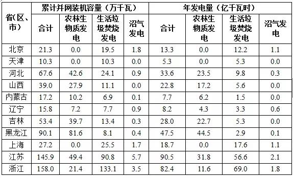 截至2017年底,全國(guó)共有30個(gè)省(區(qū)、市)投產(chǎn)了747個(gè)生物質(zhì)發(fā)電項(xiàng)目,并網(wǎng)裝機(jī)容量1476.2萬千瓦(不含自備電廠),年發(fā)電量794.5億千瓦時(shí)。其中農(nóng)林生物質(zhì)發(fā)電項(xiàng)目271個(gè),累計(jì)并網(wǎng)裝機(jī)700.9萬千瓦,年發(fā)電量397.3億千瓦時(shí);生活垃圾焚燒發(fā)電項(xiàng)目339個(gè),累計(jì)并網(wǎng)裝機(jī)725.3萬千瓦,年發(fā)電量375.2億千瓦時(shí);沼氣發(fā)電項(xiàng)目137個(gè),累計(jì)并網(wǎng)裝機(jī)50.0萬千瓦,年發(fā)電量22.0億千瓦時(shí)。生物質(zhì)發(fā)電累計(jì)并網(wǎng)裝機(jī)排名前四位的省份是山東、浙江、江蘇和安徽,分別為210.7萬、158.0萬、145.9萬和116.3萬千瓦;年發(fā)電量排名前四位的省份是山東、江蘇、浙江和安徽,分別是106.5億、90.5億、82.4億和66.2億千瓦時(shí)。2017年各省(區(qū)、市)各類生物質(zhì)發(fā)電并網(wǎng)裝機(jī)及發(fā)電量如下: