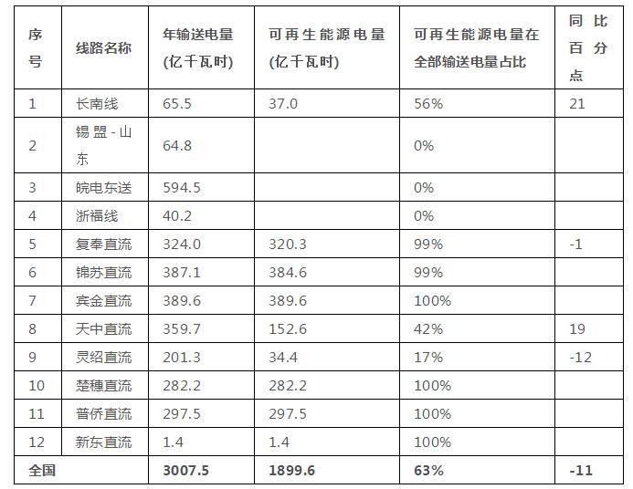 12條特高壓線路輸送電量3008億千瓦時(shí),其中輸送可再生能源電量1900億千瓦時(shí),同比上升10%,占全部輸送電量的63%,同比下降11個(gè)百分點(diǎn)。