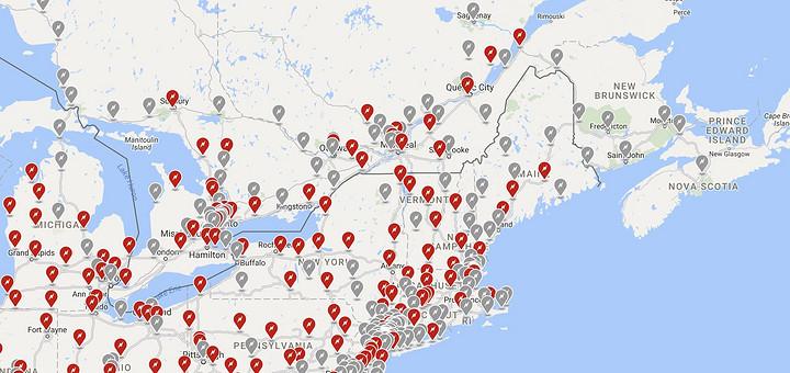 在上圖中,我們看到的紅字標記,代表的是已經(jīng)建好并投入使用的特斯拉超級充電樁,而放大該地圖時所能看到的灰色標記則代表正在新建或即將建造的超級充電樁。