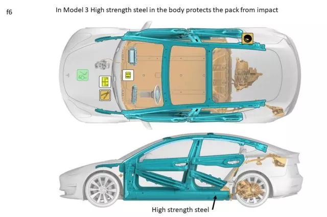 但是在 Model 3 上,高強(qiáng)度鋼的使用率大大提高。而且最主要的地方還是分布在車身以及安置電池的部分。