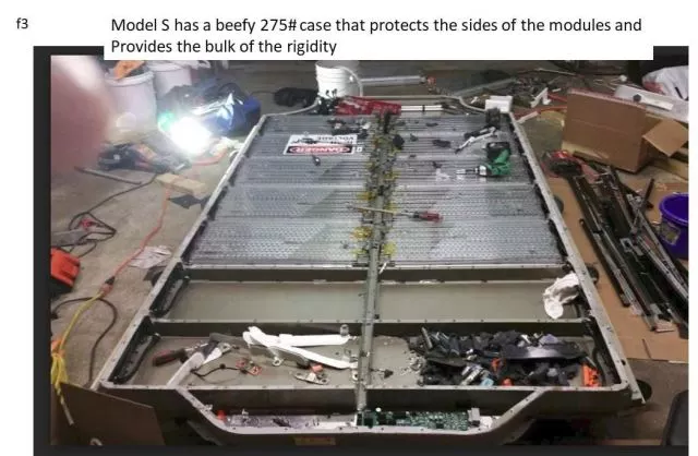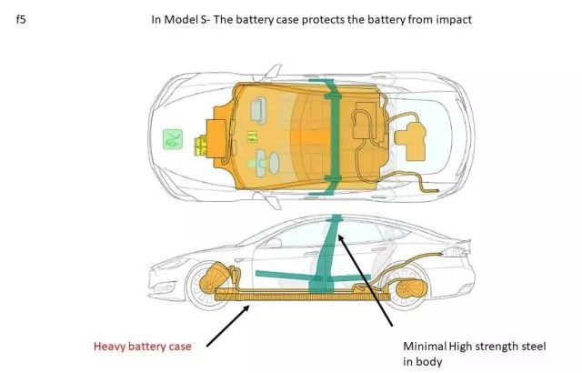 Model S 設(shè)計(jì)有一個(gè)專門用于保護(hù)電池的電池殼,重達(dá) 275 磅(約 124.74kg),相當(dāng)于電池包重量的 1/4。