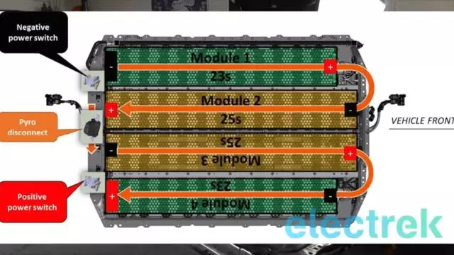 Model 3 的電池組由四個(gè)比例不同的模組構(gòu)成。其中兩個(gè)模組由 25 個(gè)電池單元構(gòu)成,另外兩個(gè)模組由 23 個(gè)電池單元構(gòu)成。每個(gè)電池單元有 46 個(gè) 2170 電芯,Model 3 總共有 4416 顆 2170 電芯。