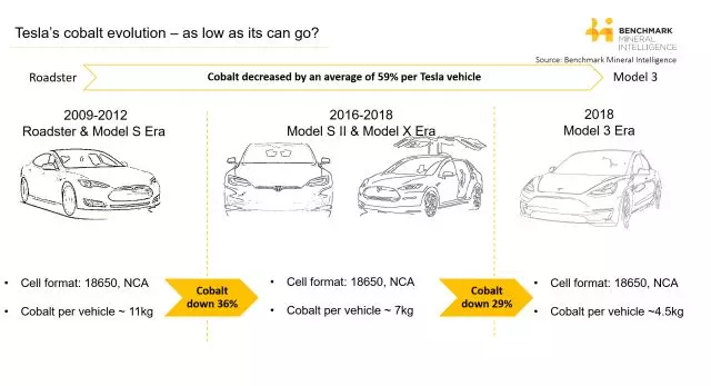 Model 3 使用的 2170 電芯將正極材料中所需鈷的含量降低到 10%以下,低于其他電池產(chǎn)商生產(chǎn)的下一代 NCM811 電池中鈷含量(即鈷含量在 10%)。這種突破使得特斯拉對鈷的需求量減少了 59%。在 2012 年,特斯拉在每輛車消耗 11kg 的鈷,到 2018 年,每輛車上消耗 4.5kg 的鈷。